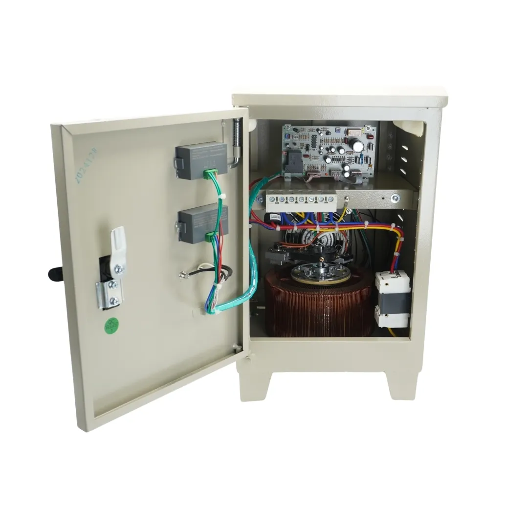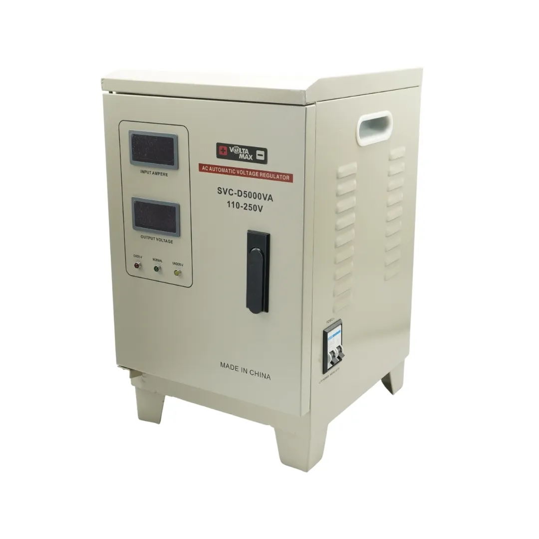 استابلایزر ولتامکس Voltamax Stabilizer تک فاز SVC-D 5KVA، مجهز به سروو موتور، ظرفیت 5KVA (توان واقعی 4KW)، محدوده ورودی 110–250 ولت، خروجی دقیق 220 ولت ±3%، مناسب برای تجهیزات صنعتی سبک و لوازم خانگی پرمصرف.