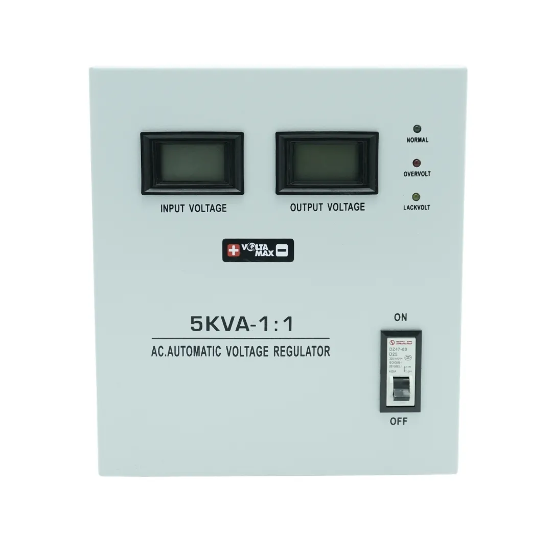 استابلایزر ولتامکس Voltamax Stabilizer تک فاز ZTY-5000 VA، توان 5000 ولتآمپر، خروجی پایدار 220 ولت ±3%، قابلیت خروجی 110 ولت، تکنولوژی سرووموتوری، مجهز به نمایشگر دیجیتال، مناسب حفاظت تجهیزات خانگی و اداری پرمصرف.