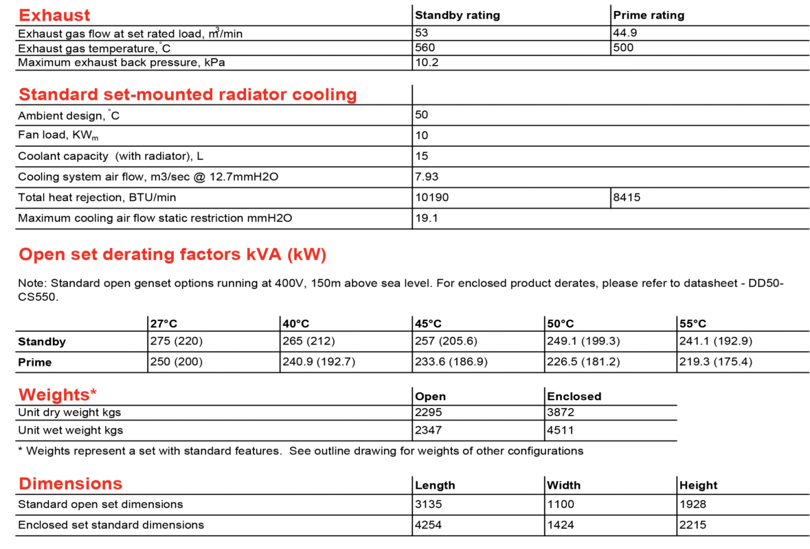 - در 27°C: Standby 275 (220) kVA (kW) — Prime 250 (200)